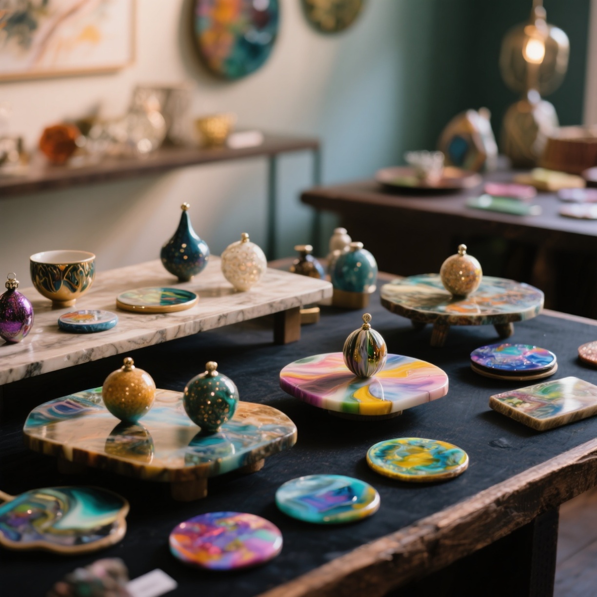 Materials: High-quality epoxy resin, pigments, molds, wood slabs
